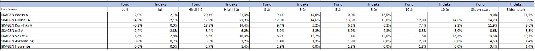 Vekstmarkedsfondet SKAGEN Kon-Tiki klarte heller ikke å slå indeksen i juli. Fondet havnet så vidt i minus med 0,2 prosent fall mens indeksen så vidt kom seg over streken med 0,3 prosent. Du kan se flere avkastningstall nederst i artikkelen.