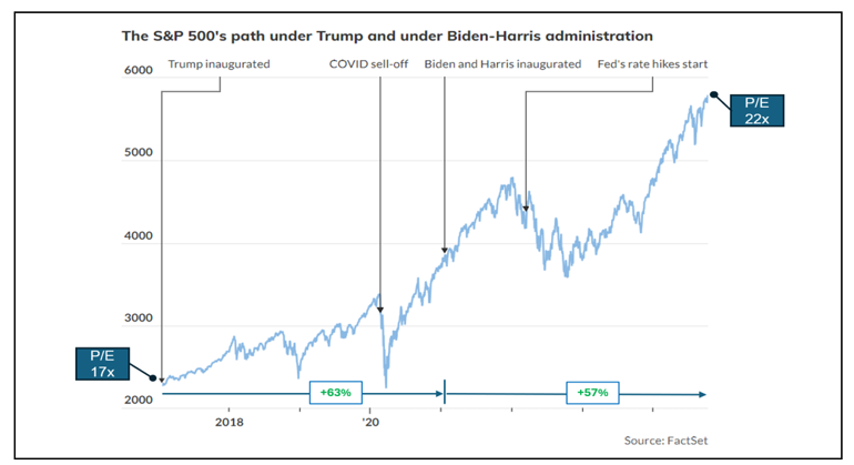 Under Trumps første periode i embetet var det amerikanske aksjemarkedet en av hans favorittindikatorer for landets (og hans egen) prestasjon. S&P 500-indeksen steg 63 prosent under hans administrasjon, en fireårsperiode som inkluderte det bratte fallet under COVID-19 i 2020, tilsvarende avkastningen siden Joe Biden tok over i 2021.