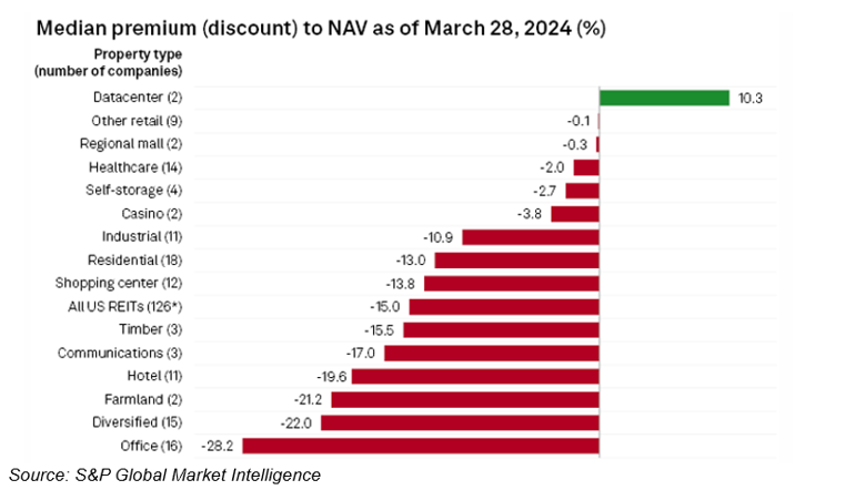 I USA, hvor SKAGEN m2 har majoriteten (36 prosent) av sine eiendeler, handles REIT-er for tiden til en 15 prosent rabatt til NAV, med bare datasentersegmentet som handles til en premie, mens andre, spesielt kontorer, er priset til dypt rabatterte verdier.