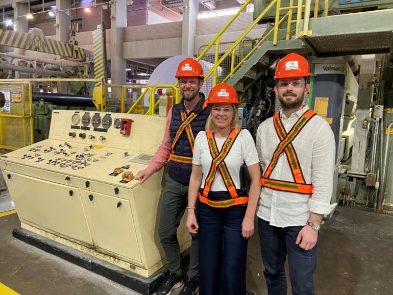 På en guidet tur inne i selskapets lokaler blir vi nok en gang minnet på kontrastene – eksteriøret er ikke representativt for interiøret på møllen. Effektiviteten er imponerende, og det samme er fuktigheten og varmen papiret tørkes i. Møllen drives av rundt 1200 ansatte, som jobber i tre roterende skift i en svært automatisert produksjonsprosess. Mens vi ser på papirproduksjonen, lærer vi at når papirmassen er dannet, tar det bare 4,5 minutter fra tørkeprosessen til ferdig produkt.
