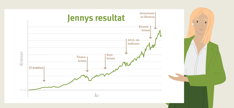 Jenny kunde inte bry sig mindre om finanstidningar och gurus, och hur börserna fluktuerade från dag till dag. Ska räntorna gå upp eller ner? Och hur är det med oljepriset? "Inte en aning", sa hon. Inte så att hon var likgiltig för vad som hände runt henne, hon var bekymrad över både samhällsutvecklingen och händelserna i världen runt oss. Men hon hade absolut inget intresse av att uppmärksamma det från dag till dag för att hitta den perfekta tiden att investera i aktier och fonder.