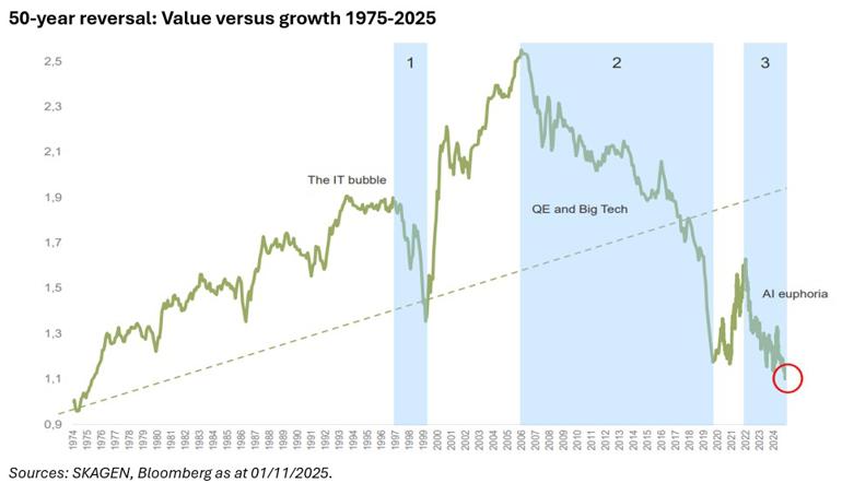 AI euphoria also means that value stocks globally have now given back all the outperformance they accumulated relative to growth stocks from 1975 (when MSCI records began) to 2007 (the financial crisis). With many commentators’ likening today’s extreme environment to the IT hype at the turn of the century, the potential for a repeat of value’s multi-year relative gains once that bubble had burst is similarly stark.